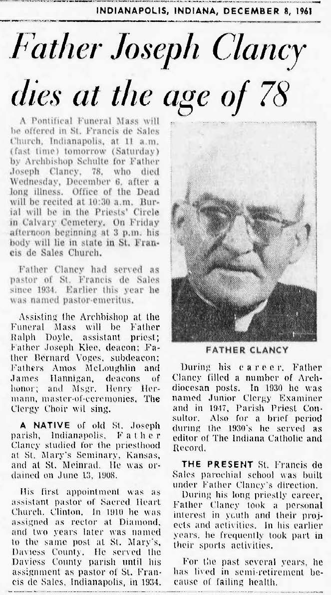 Burial Info: Calvary Cemetery, Priests Circle – Indianapolis, IN – 1961 Dec 9