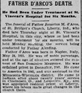 D’ARCO, JANUARIUS, born in Naples , Italy, May 24, 1818; joined the Dominicans in 1837; came to the U.S. with Provincial Father Wilson in 1844; labored two years in Wisconsin and five years in Nashville, Tenn. during the Civil War, and nineteen years in Ohio. He came to Liberty, Indiana, in January 1872. That pastorate he held 20 years till he retired on account of old age in 1892, residing in Liberty. He died in dt. Vincents Hospital, Indianapolis , on June 1, 1899 and was buried from St. John’s church, Indianapolis.